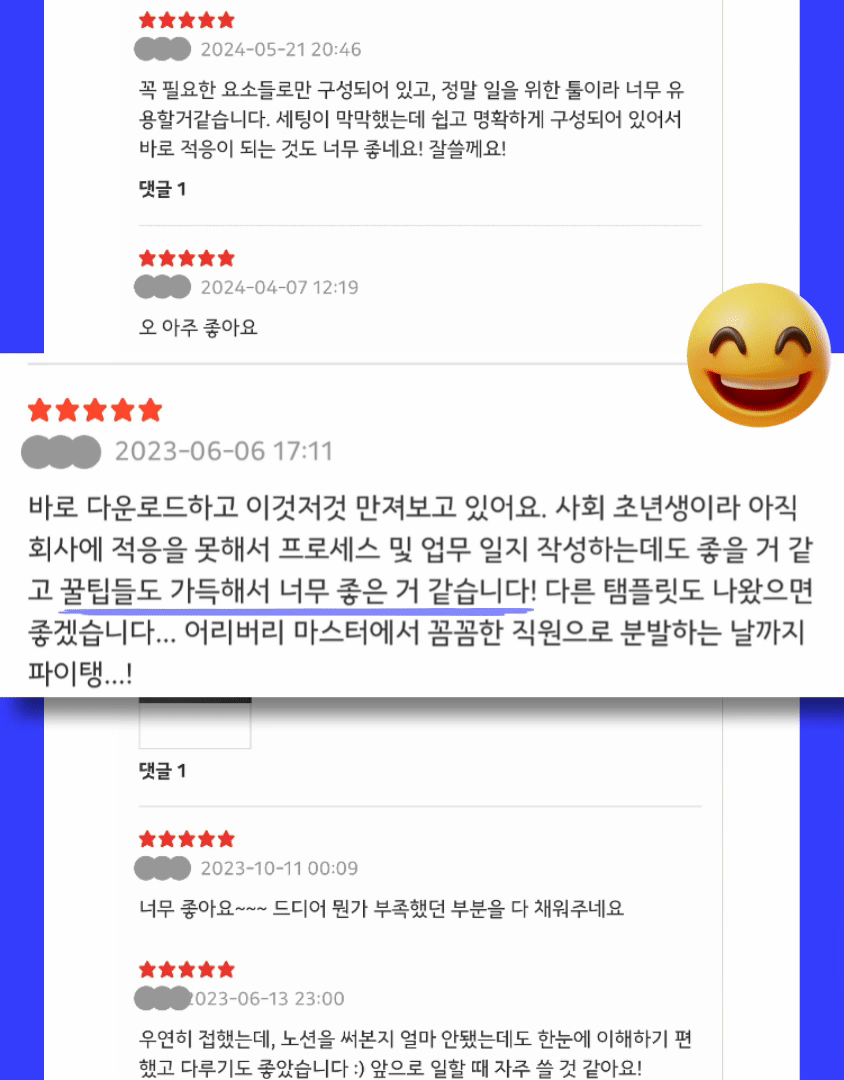 ✔️ 리뷰를 남겨주신 분께는 추가 템플릿 2개를 보내드립니다. 리뷰를 남기고 하단 채널톡에 알려주세요!
